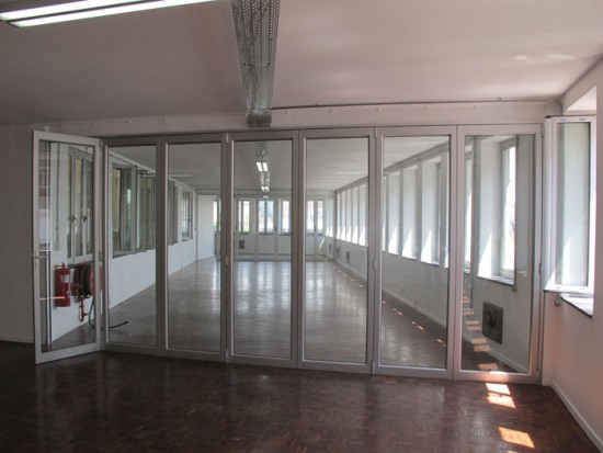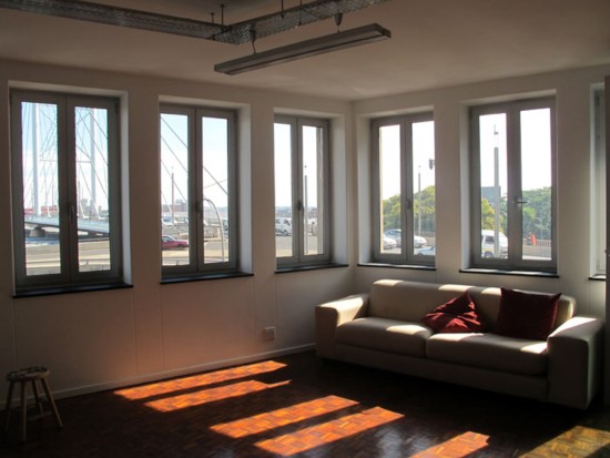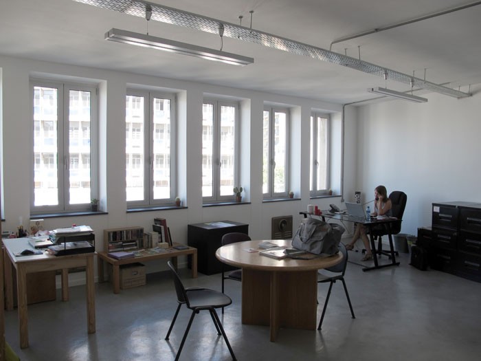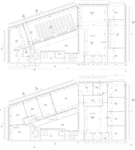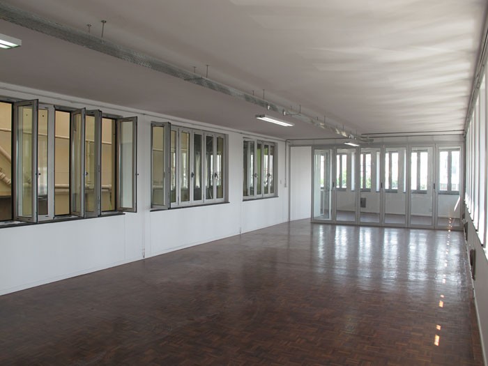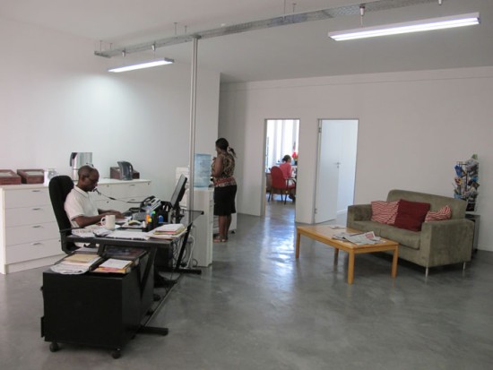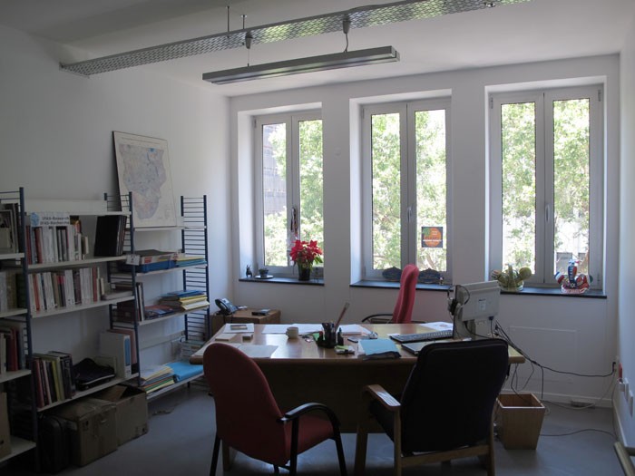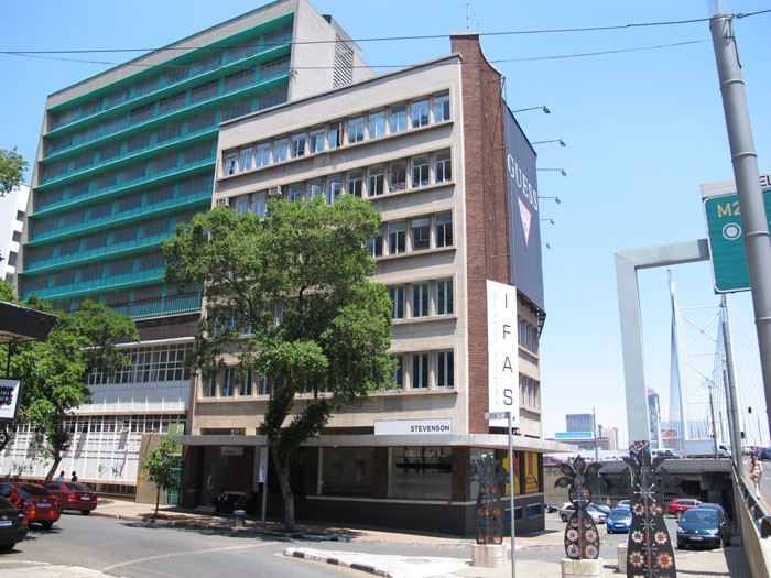 Located in the city center near the Nelson Mandela Bridge, the building at 62 Juta Street houses the French Institute of Johannesburg. Two 291 m2 (3,132 sq. ft) floors present great potential: high ceilings, vast, bright, transversal spaces that are well-ventilated, with views of the trees to the north and the city skyline to the south. The IFAS project combines common spaces for temporary use on one floor and permanent, more private spaces on the other. For greater comfort, all the exterior joinery has been replaced by double-glazed aluminum. Exposure to the exterior, walk-through space, natural ventilation, and insulated bay windows eliminate the need for air conditioning and heating. When night falls, the building lights up with the colors of the French flag, clearly positioning the cultural institute in the public eye.