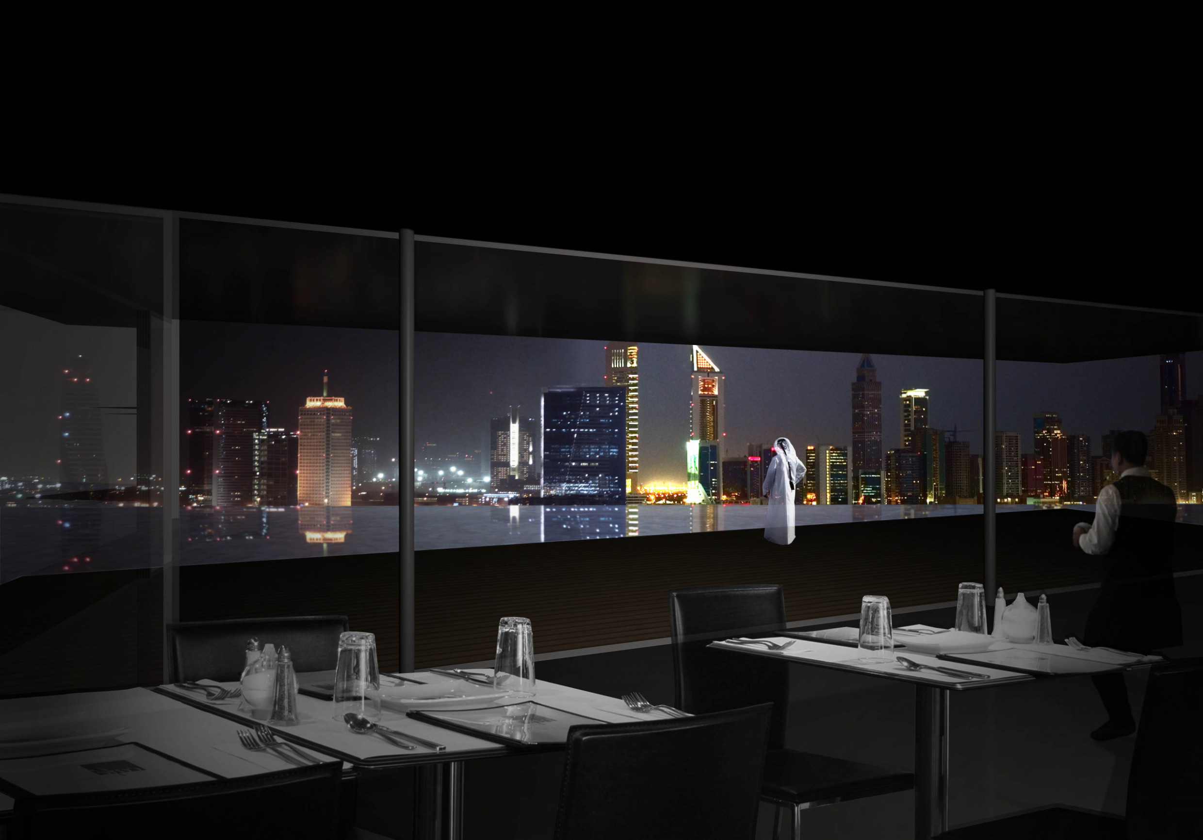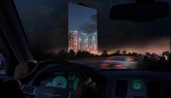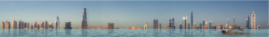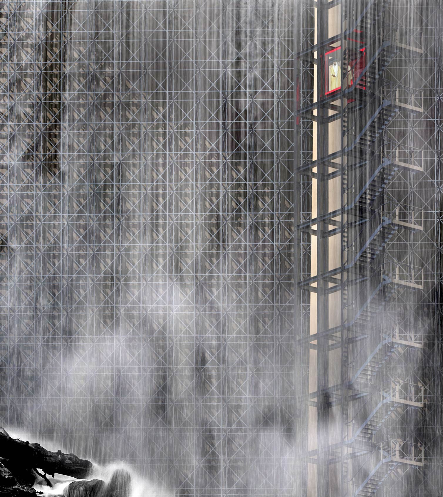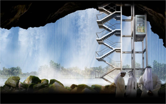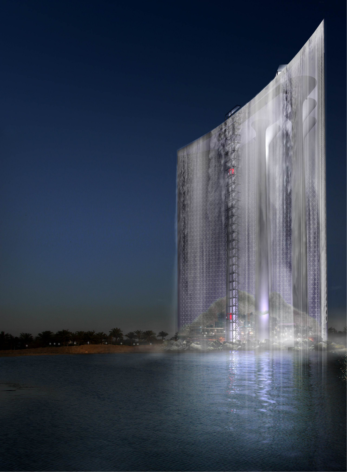 A waterfall building in answer to a desire for cultural and urban innovation in Dubai. A spectacular building, composed of six 110 m-high (360 ft) water storage towers. The mastery of water, a precious resource, is a major universal challenge. The building reproduces a waterfall comparable to the most remarkable natural sites, introducing a new dialog between nature and artifice. Its monumental, magnificent, and mythological character is mainly due to its proportions, its relationship to the city, and the power and energy of water. It evokes the wonders of the world with radicality and force.