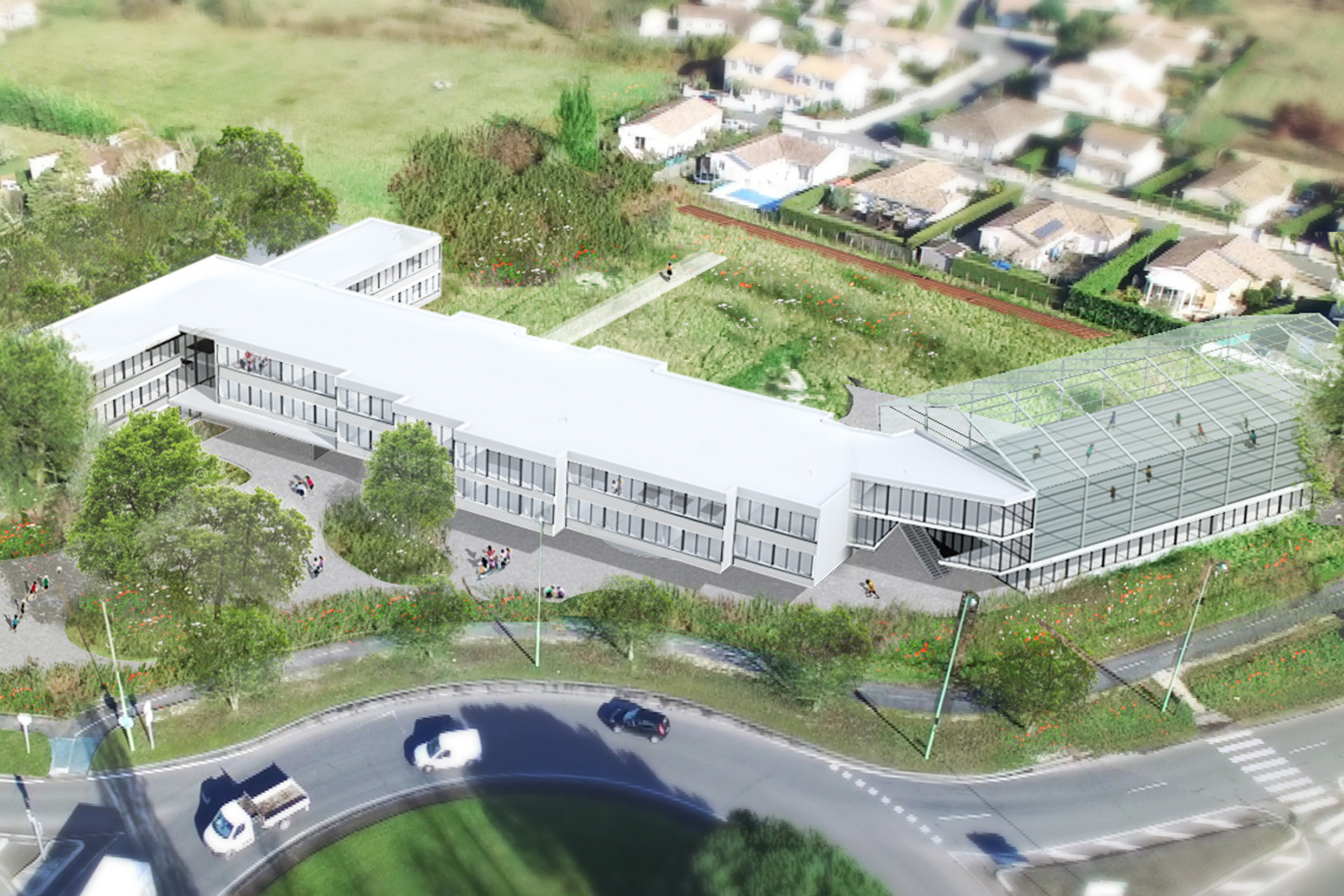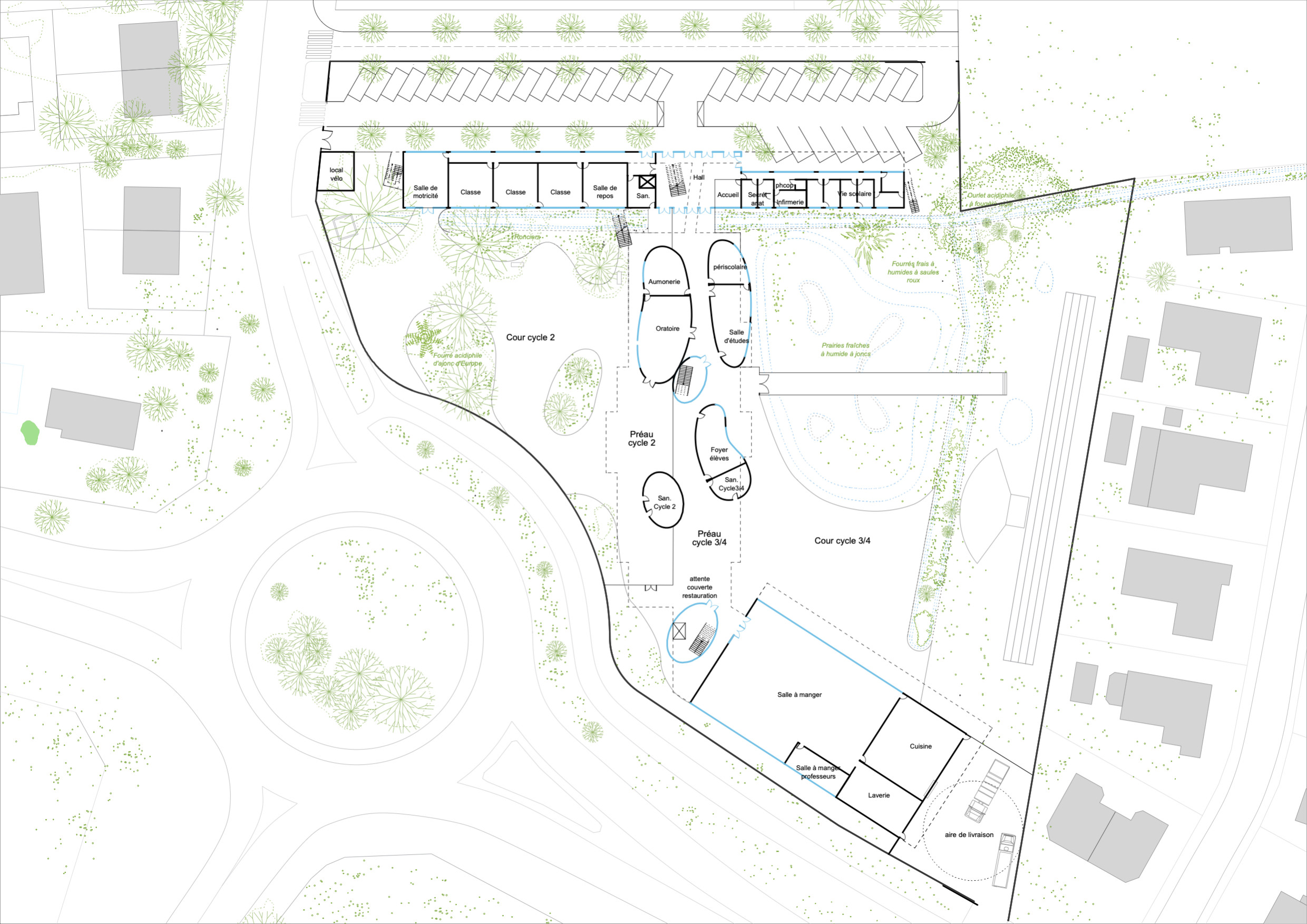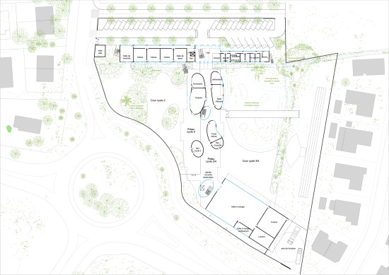 The objective was to build while preserving all the qualities of the site, sealing the soil as little as possible to occupy a limited amount of land. The aim was to promote biodiversity by offering an environment conducive to individual well-being and development. The plot of land is envisaged as a support for discovery, play, experiment, and learning in relation to nature. The construction follows a rationally regulated post and beam concrete system. It offers great freedom in the layout, ensuring the flexibility and modularity necessary for the school’s future development. The classrooms open onto the gardens.