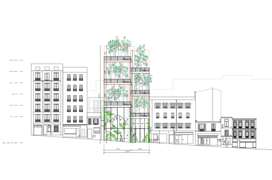 The “vertical housing estate” concept proposes an infrastructure composed of eight bare building plateaus, spread over 6 levels, starting from the first floor. The program involves the construction of eight duplex dwellings by inhabitants in volumes 6 m (20 ft) high. Each dwelling consists of a garden with soil 1 m (3’28”) deep. The infrastructure with a very high slab height is built on stilts to free the ground floor area over the entire plot, leaving 275 m² (2,960 sq. ft) laid out like a mountain garden, a small Pyrenean topographical world of rocks, lichens, ferns, and a stream with wild trout.