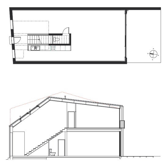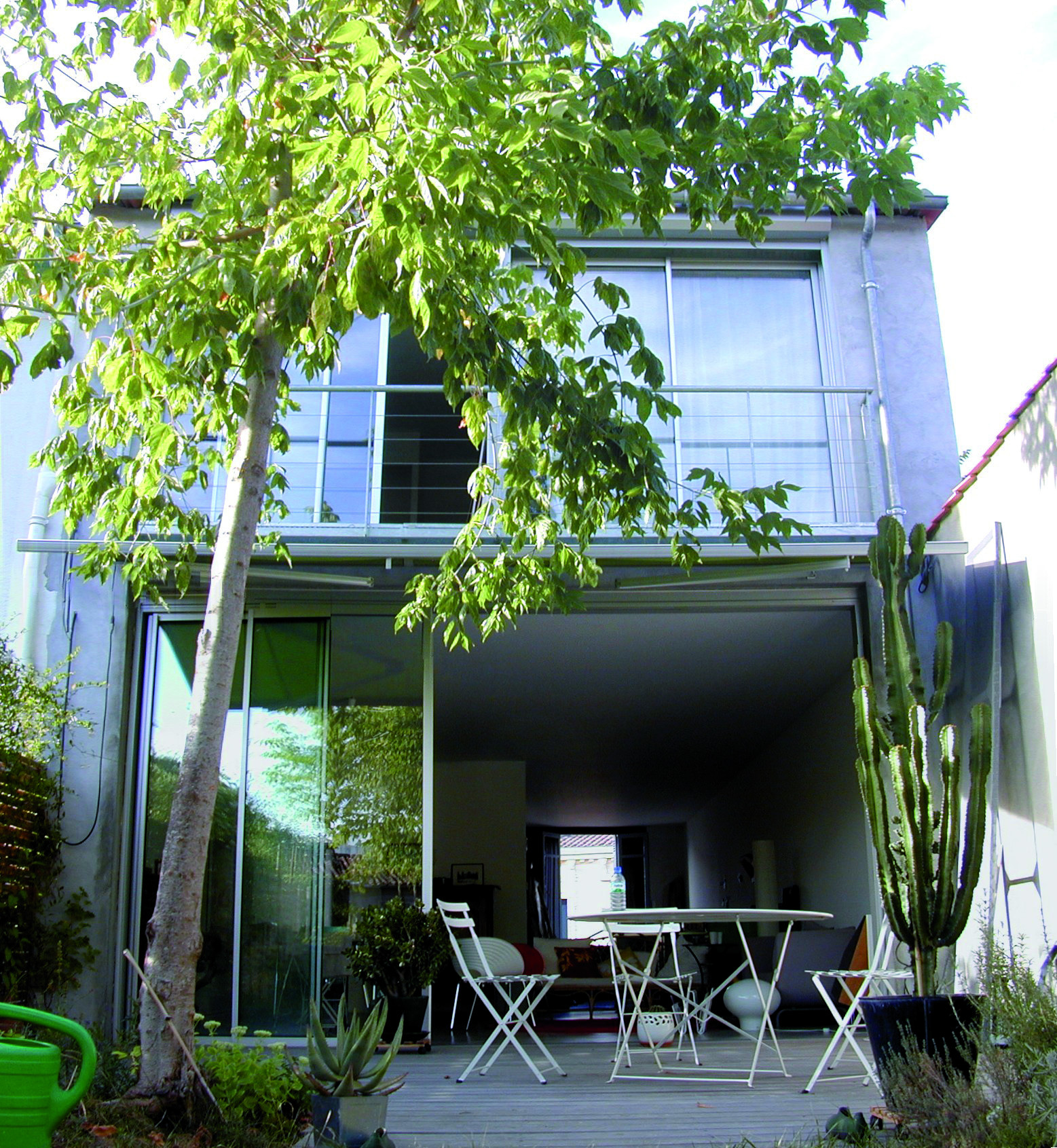 For this renovation of an échoppe, a very common type of housing in the suburbs of Bordeaux, only the facade was preserved. The plan and cross-section were completely rethought to propose a minimal layout solution and contemporary architecture. The ground floor is open-plan and walk-through. The whole of the very long, narrow plot is thus visible from the street. The clients wished to enjoy all the conventional spaces of a house, with minimum partitioning. A straight staircase partitions the space while enabling a smooth flow of movement. The entrance, kitchen, and living area are organized around it. A four-leaf sliding window offers maximum openness to the garden and creates a direct relationship between the interior and exterior.