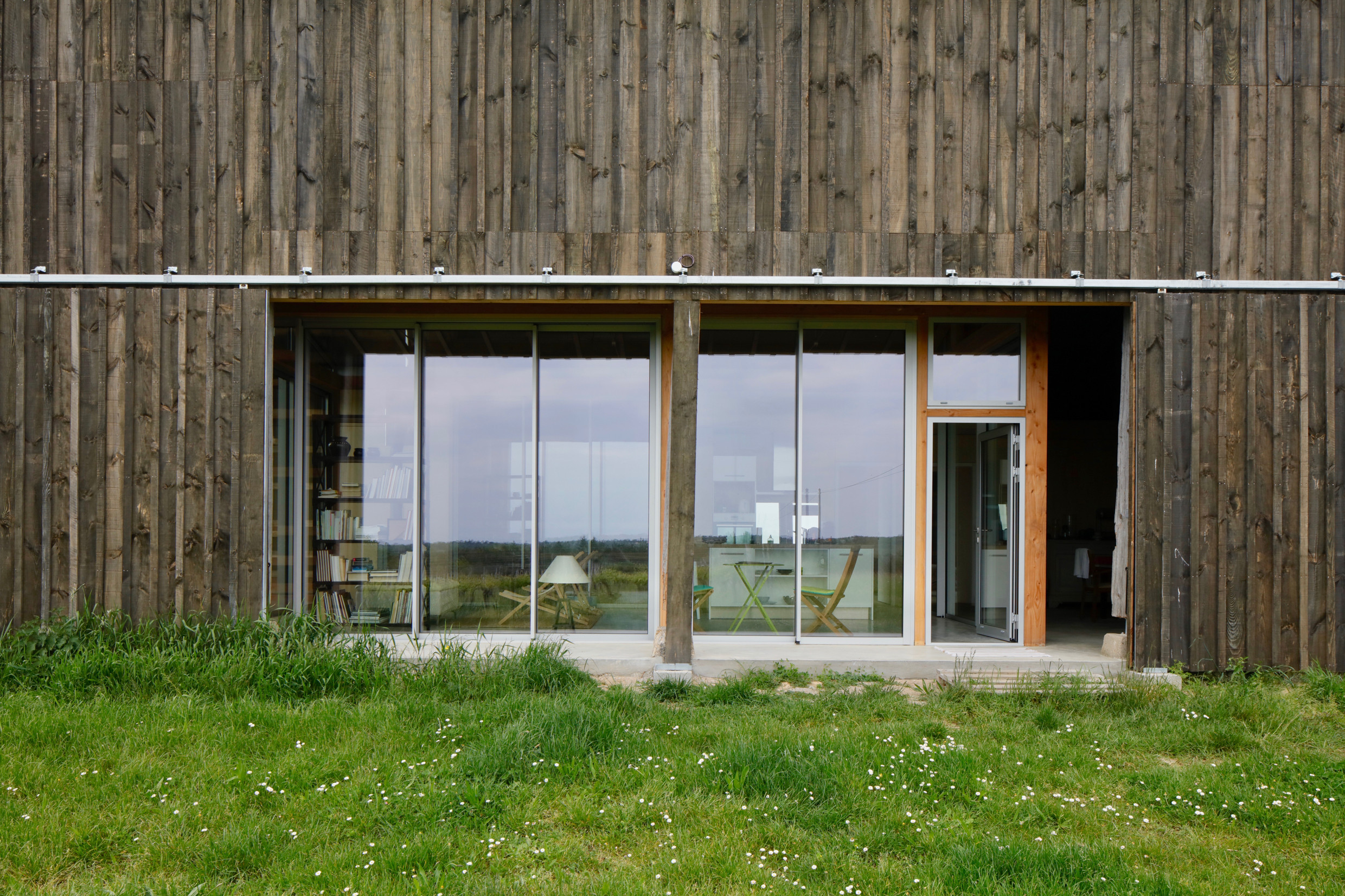 Only the posts that hold the house together were preserved: those of the dryer, the old roof framework, the vertical openings, the large mechanized glass door, the wood and metal structure, and the large sliding windows surrounding it. A blond wood module, fitted like a piece of furniture for the bedroom and bathroom, was installed facing the landscape in the existing lean-to. Like a precious object in a rustic envelope, almost invisible from the outside.