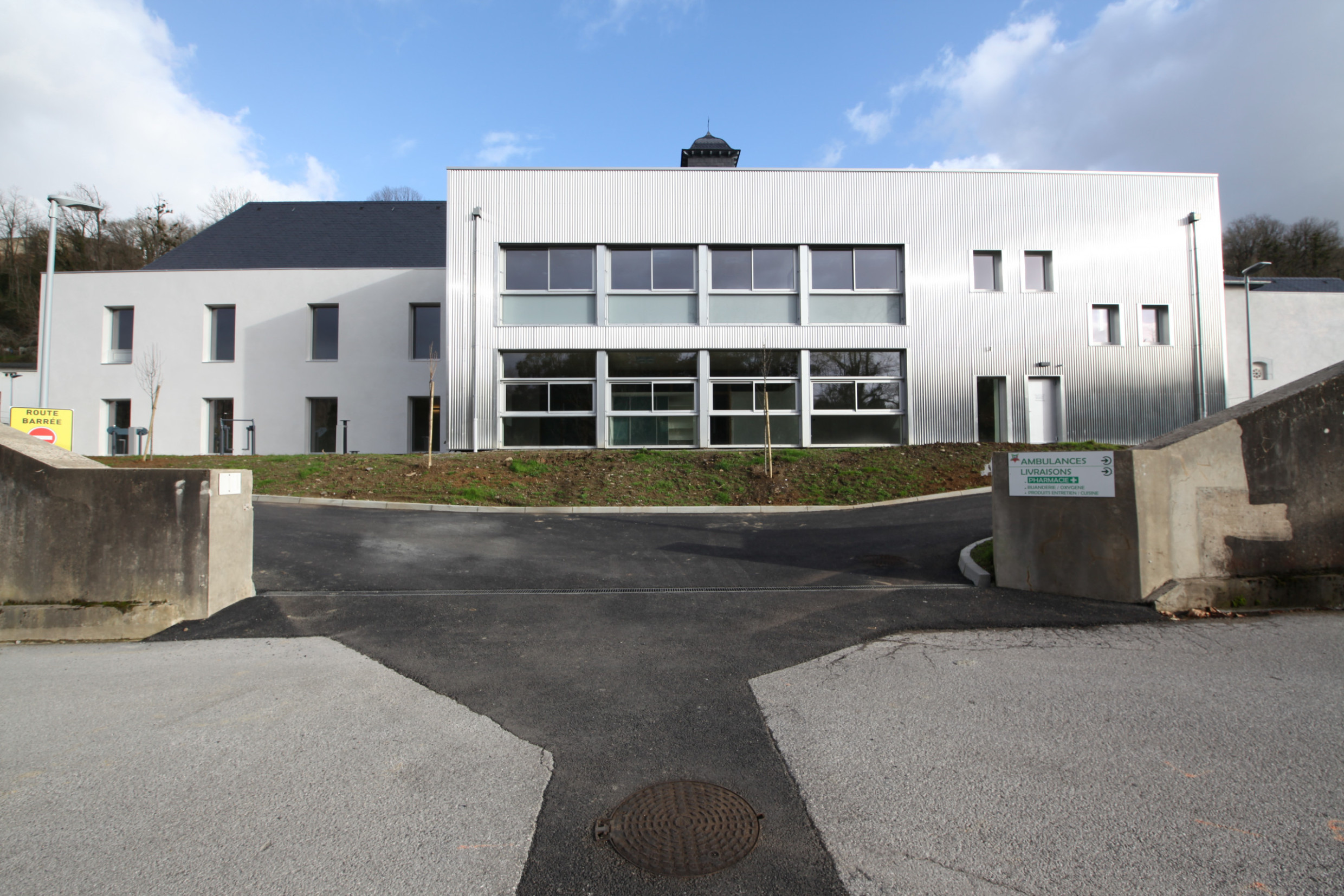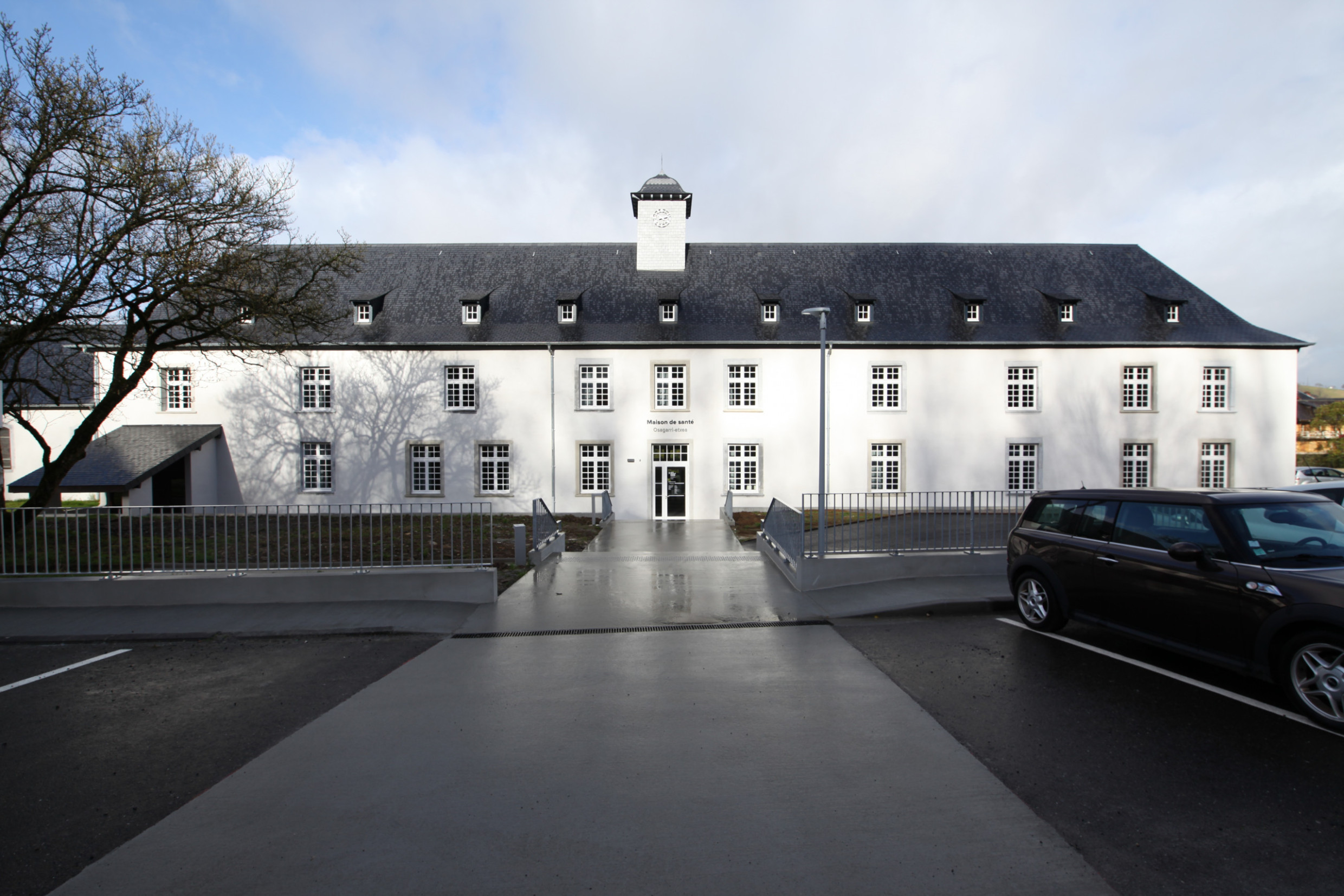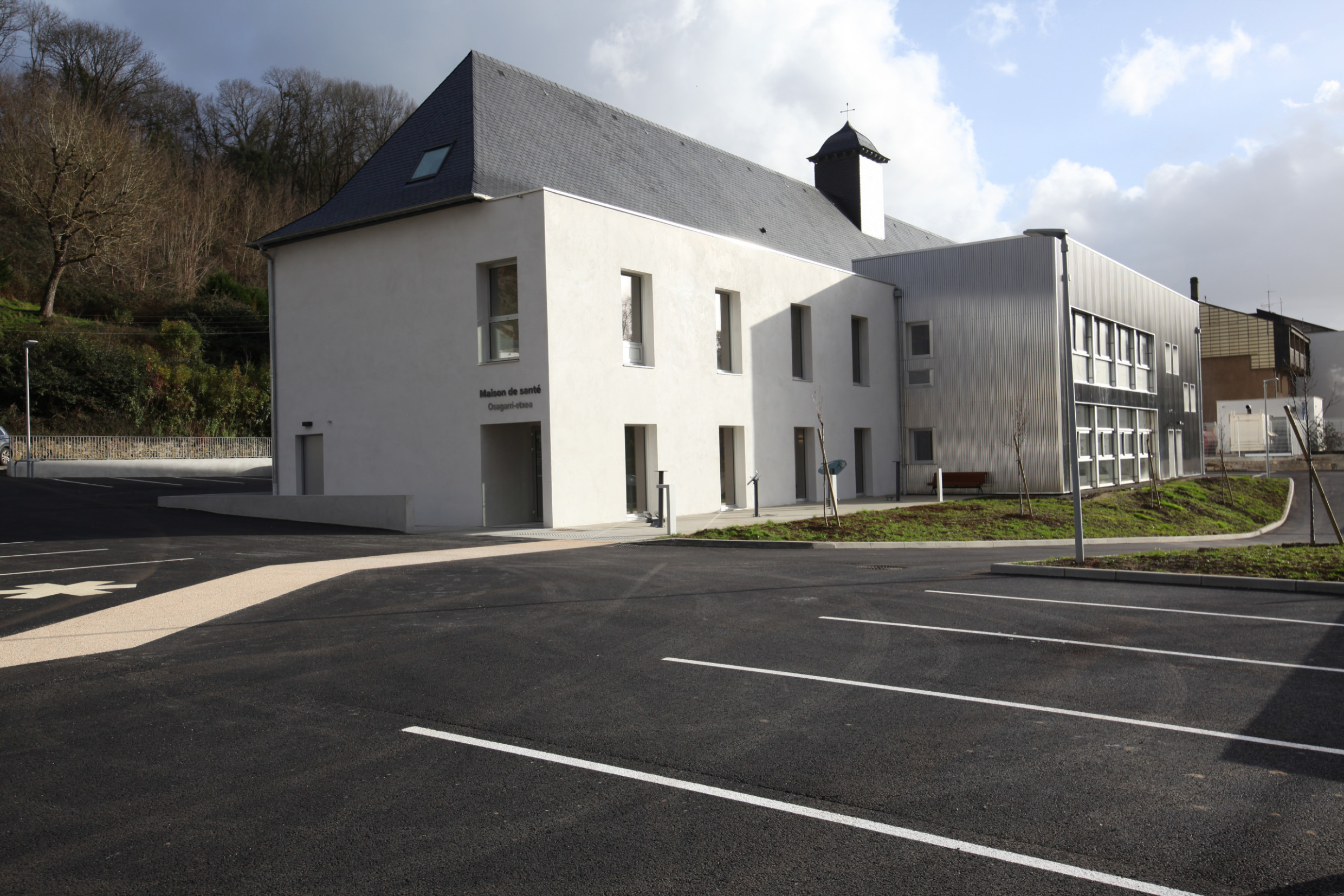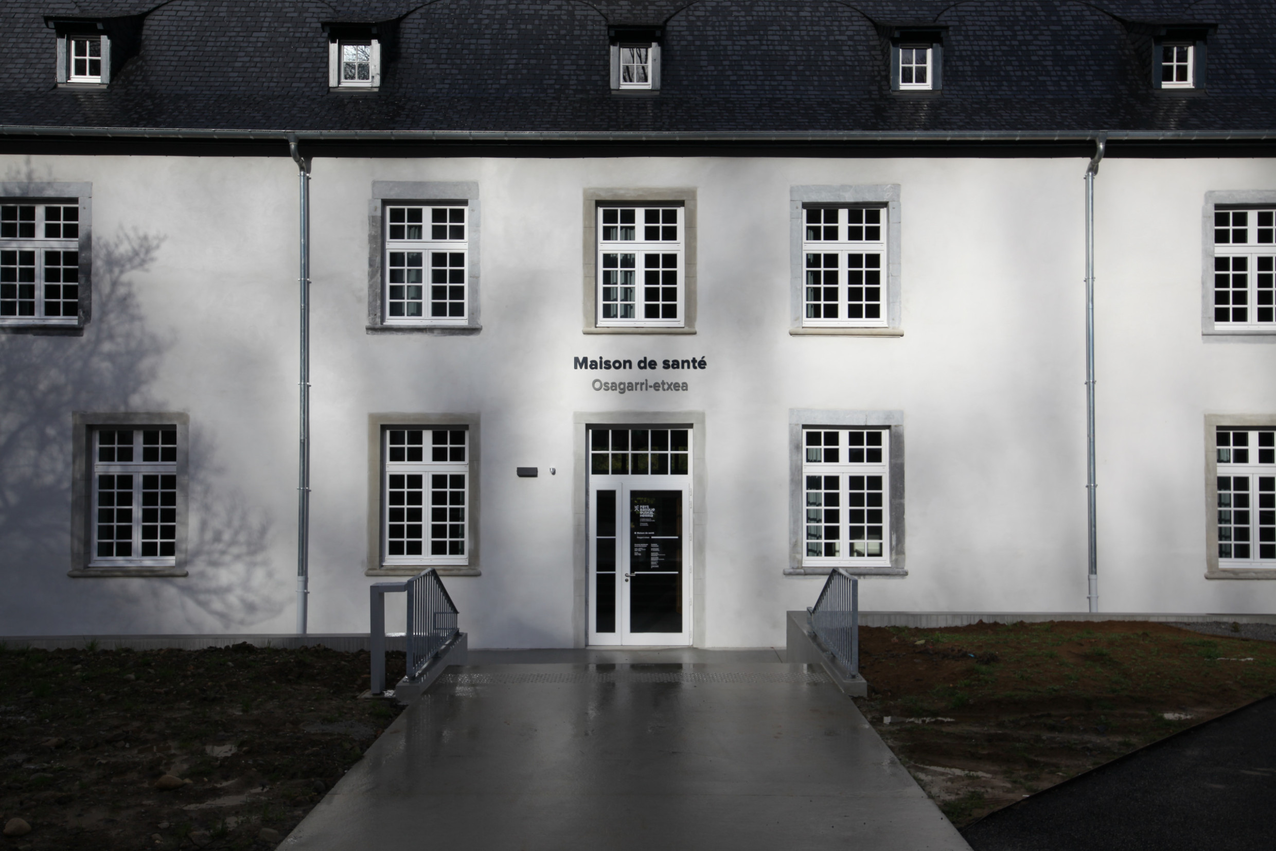 This hospice building dating from 1730 is located within the protected perimeter of the listed castle of Mauléon. Its classic 18th-century facade is characterized by large openings and bears witness to the building’s history. Its original shape, with a symmetrical truss and a traditional slate roof, evokes the reduction of a mountain to two slopes, the ubac and the adret, one in the shade, the other in the sun. On the one hand, the building envelope is treated in a traditional way with a recoated facade. On the other, it is modified in a contemporary way and covered with cladding reflecting the colors of the river and the woods facing it. This ambitious medico-social program includes all the healthcare facilities on the ground floor of the historic building. The first floor houses the medical-social center, specialists, and dental surgeries. In view of the building’s architectural and heritage value, the works were limited to a strict minimum: renovation of the existing building, improvement of access from the street and parking areas, and planting of cherry trees.