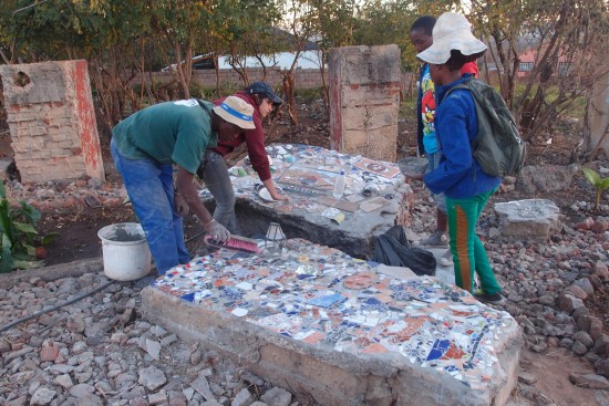 Lors du chantier Learning From SKY en 2013, nous invitons l’architecte Carin Smuts à passer deux jours avec nous. Sur place, elle propose de travailler avec les enfants sur la récupération et le tri des débris de verres, de tuiles et de faïences qui jonchent le sol du quartier informel. Cela permet aussi de contribuer au nettoyage de l’orphelinat. Une fois récoltés, tous ces petits morceaux sont lavés, brossés, triés et classés en fonction de leurs couleurs et de leurs tailles. A partir de là elle met en place différents ateliers de réalisation de mosaïques destinées à recouvrir et décorer tous les ouvrages construits. Les mosaïques sont conçues en fonction des différents supports identifiés et selon des dessins produits également par les enfants.