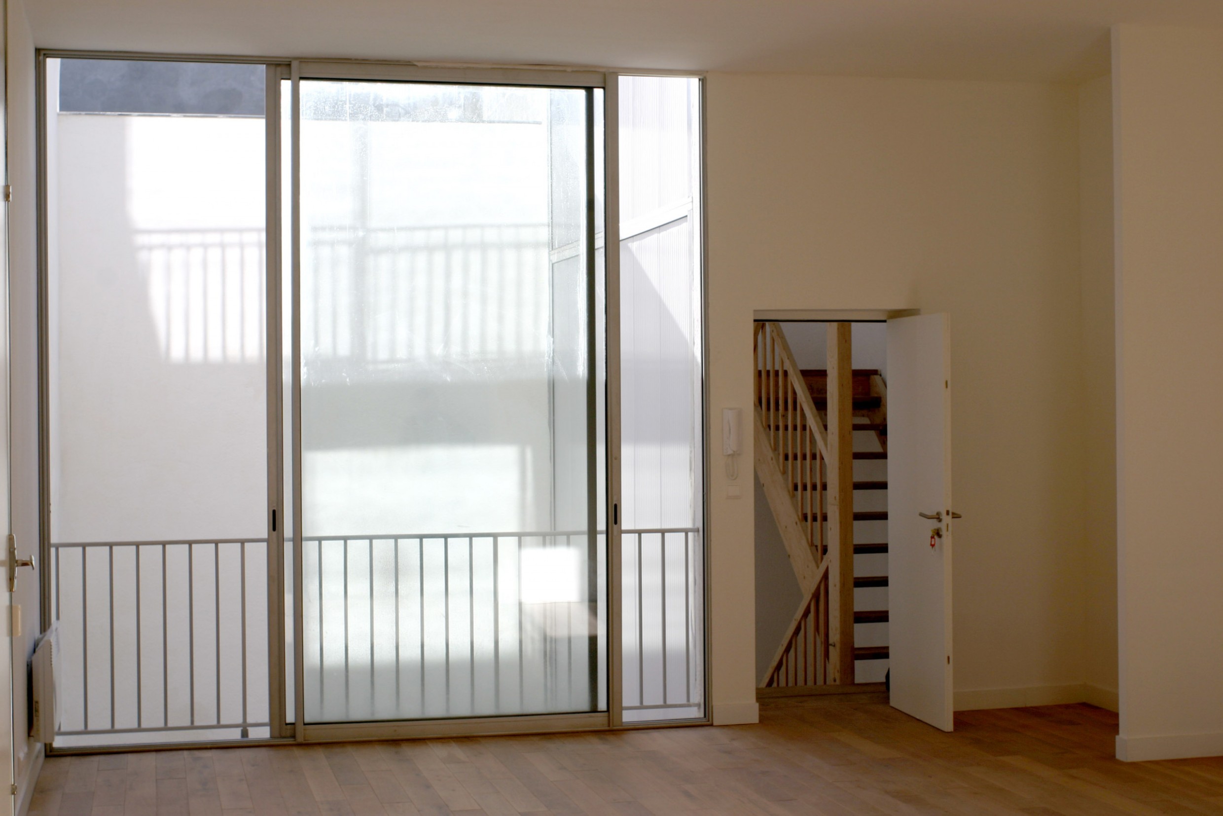 Les logements donnent sur une cour à l’arrière du bâtiment (cage d’escalier et façade totalement vitrées).