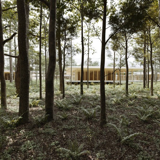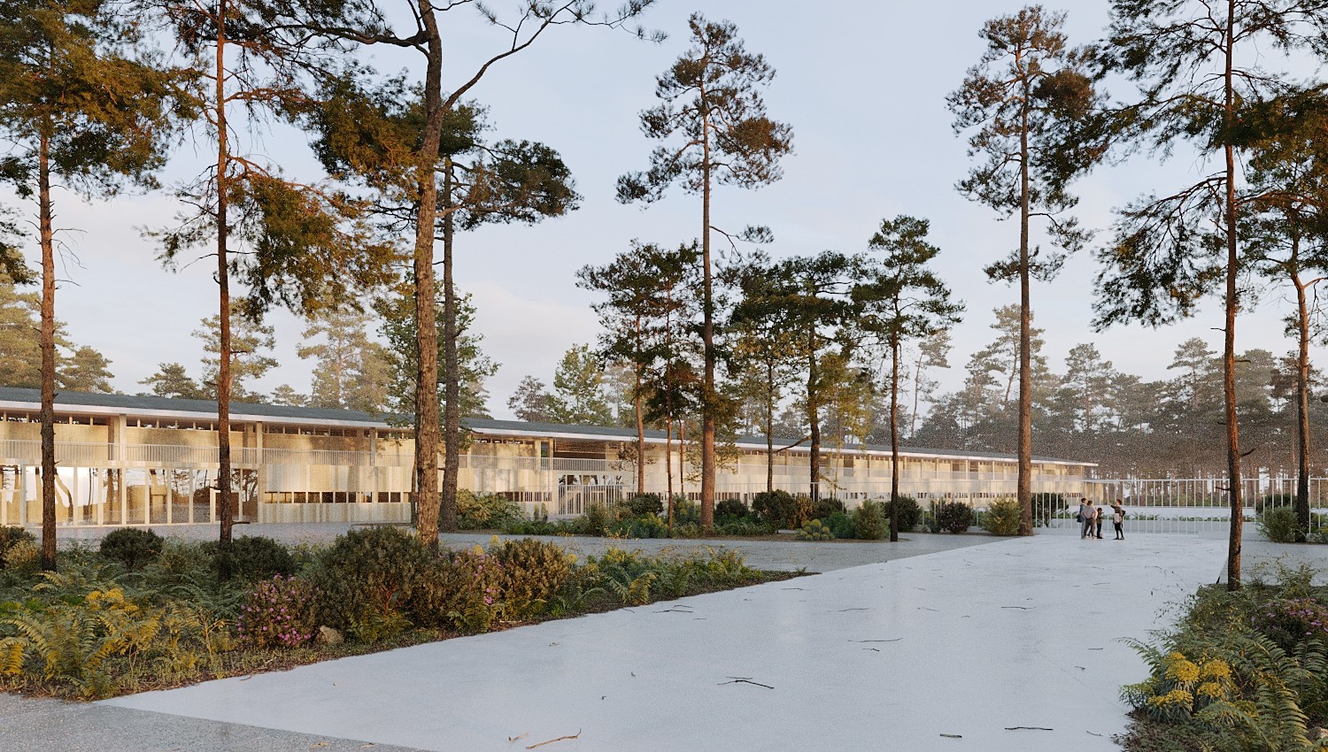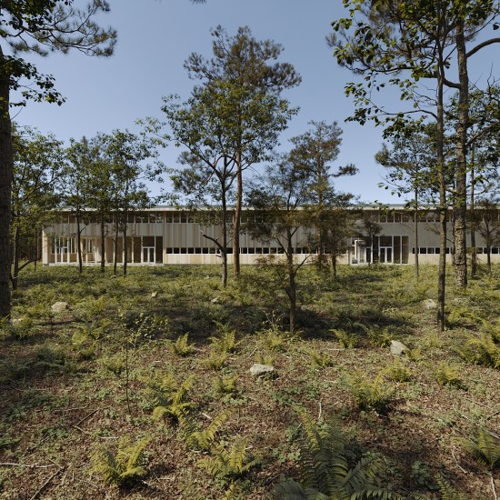 Le projet crée un lien entre le paysage typique des landes (pins et fougères), et la forêt aux multiples essences située dans le vallon, au nord de la parcelle.