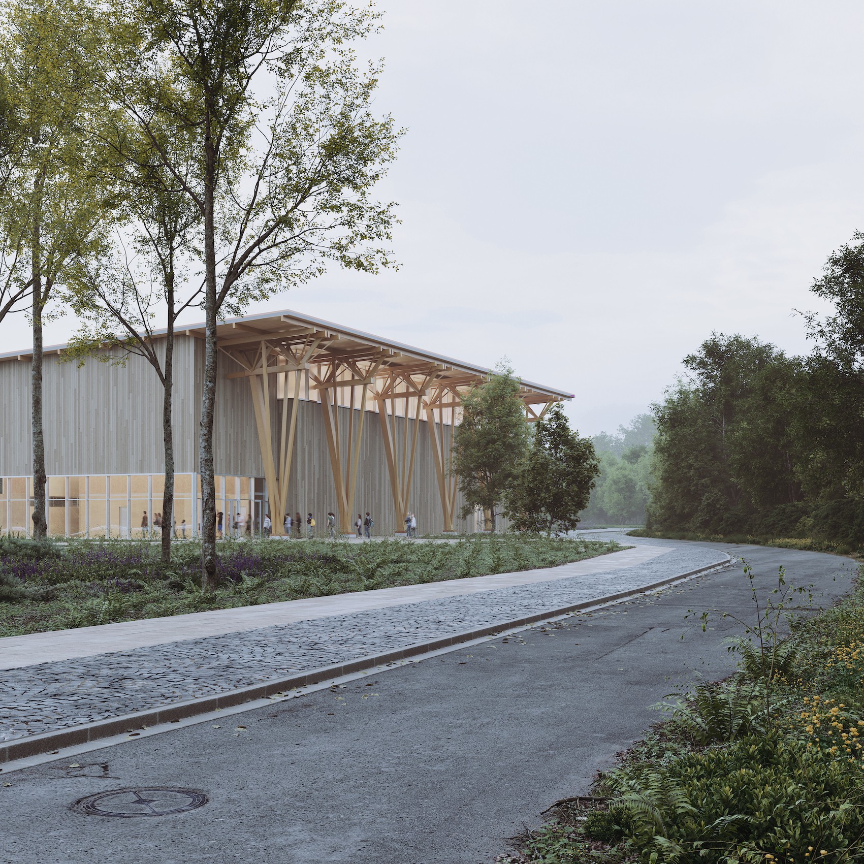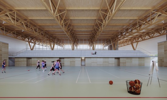 Le gymnase est implanté en vis-à-vis du collège, tourné vers la vallée naturelle et la forêt qui les séparent.