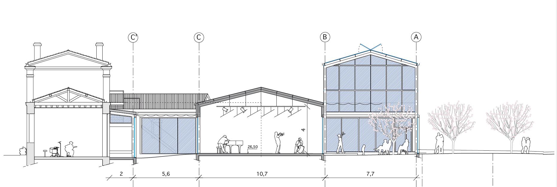 Ces espaces dédiés à l’improvisation permettent d’une part des apports solaires pour les nouvelles salles orientées nord, d’autre part l’extension des activités de l’école et l’apparition de nouvelles pratiques artistiques.