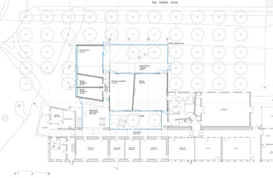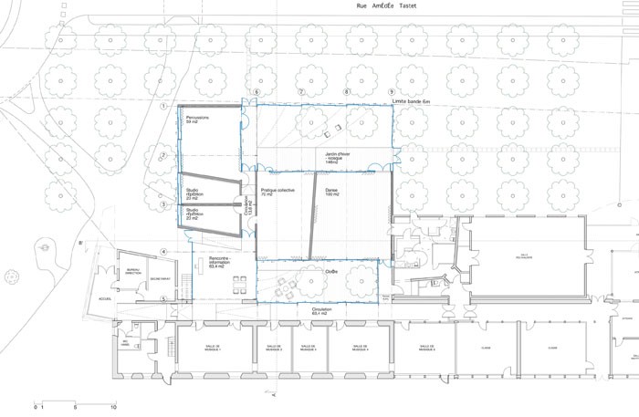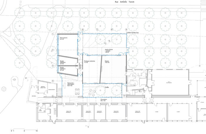 Le projet s’implante sur l’emprise au sol maximale définie par le corps principal de l’école. Le pôle danse, à proximité de la salle de danse existante, et les pôles musique sont regroupés autour d’un jardin intérieur, d’un point rencontre-information et d’un kiosque jardin d’hiver.