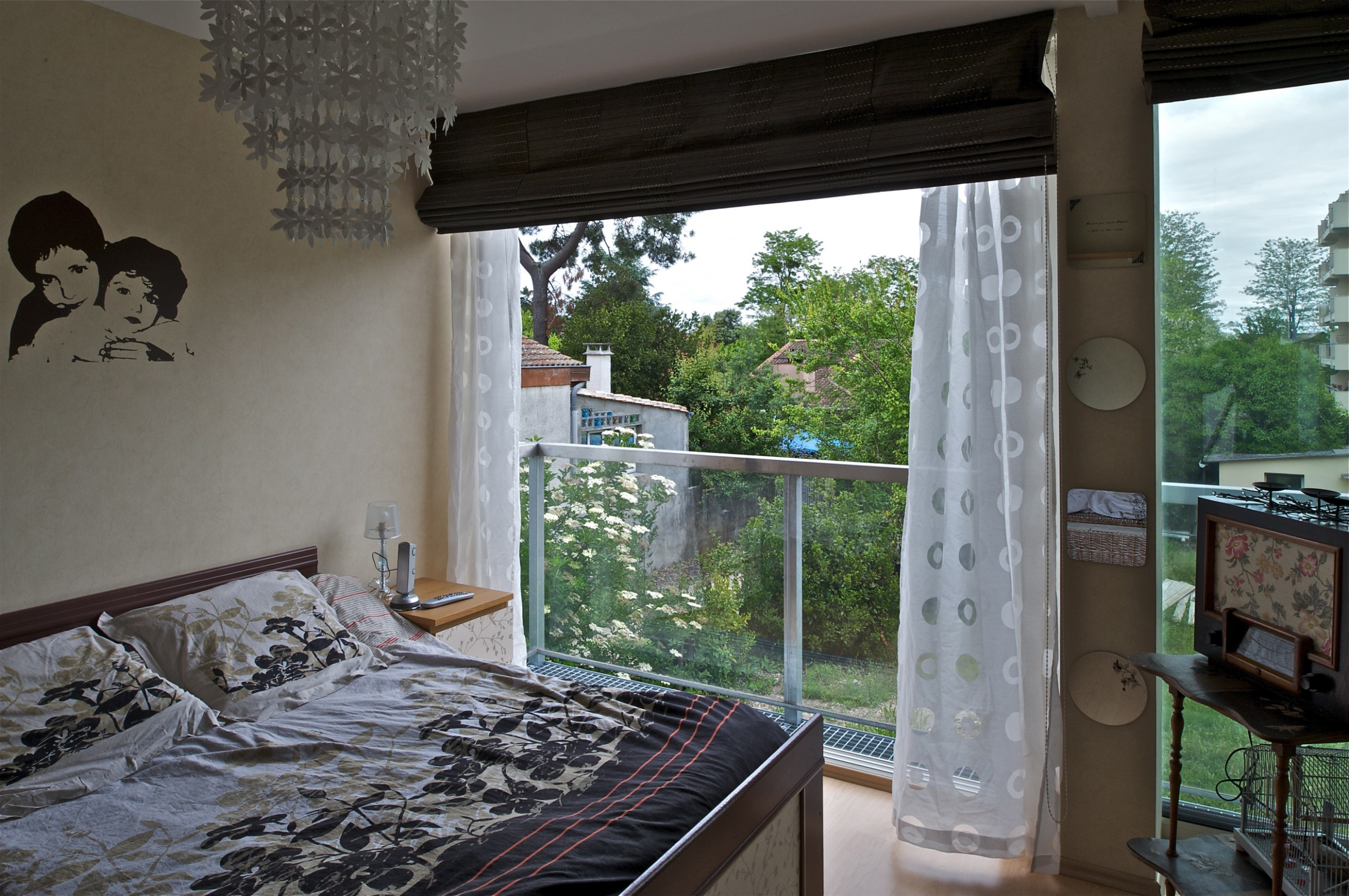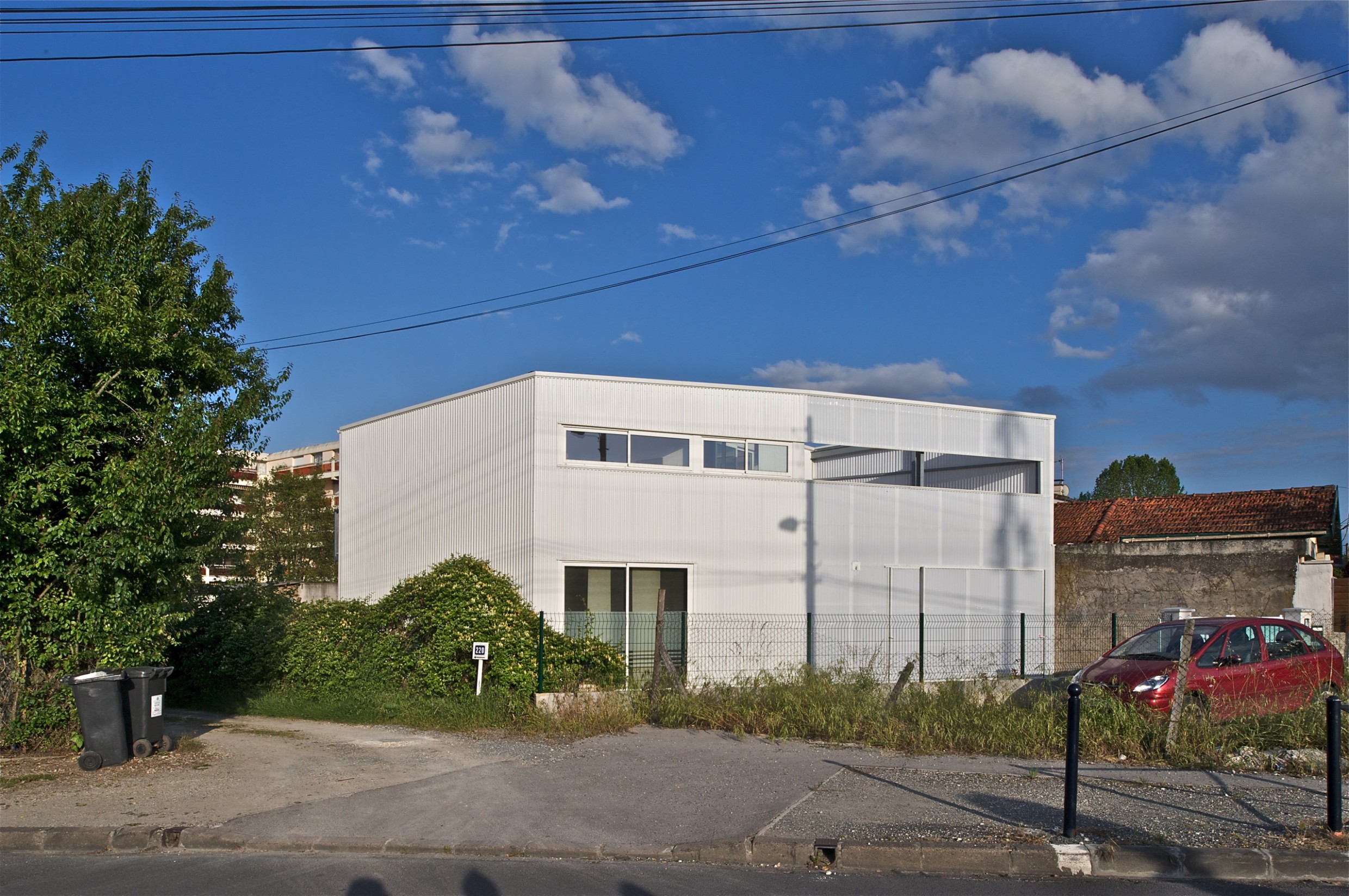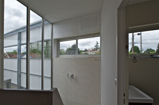 Cette maison de ville sur deux niveaux, située dans un quartier résidentiel, est implantée sur une parcelle frappée d’alignement. Cette contrainte est à l’origine de sa forme trapézoïdale. Un patio intérieur comprenant une place de parking et un cerisier est aménagé dans la pointe du trapèze. Le patio est composé de parois transparentes et translucides permettant, par un jeu complexe de lumière et de matière, de filtrer l’extérieur et de se protéger des vis-à-vis sur la voie publique. L’intérieur du logement est composé de vastes pièces rectangulaires. Le séjour-cuisine au rez-de-chaussée et les chambres à l’étage s’ouvrent sur l’extérieur et bénéficient d’une large vue sur le jardin en fond de parcelle.
