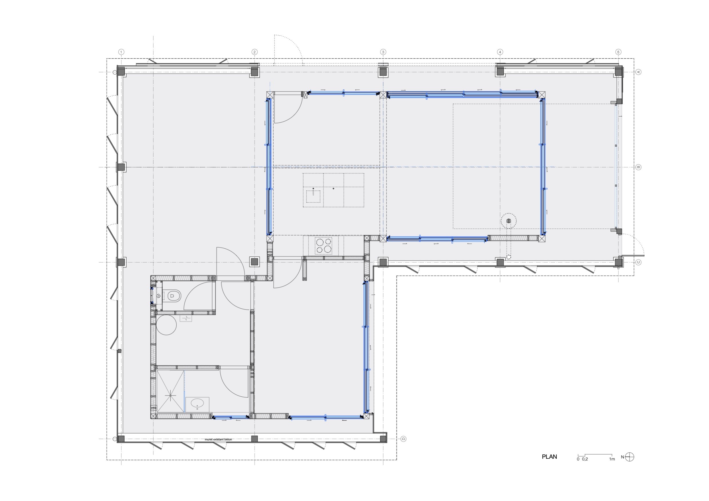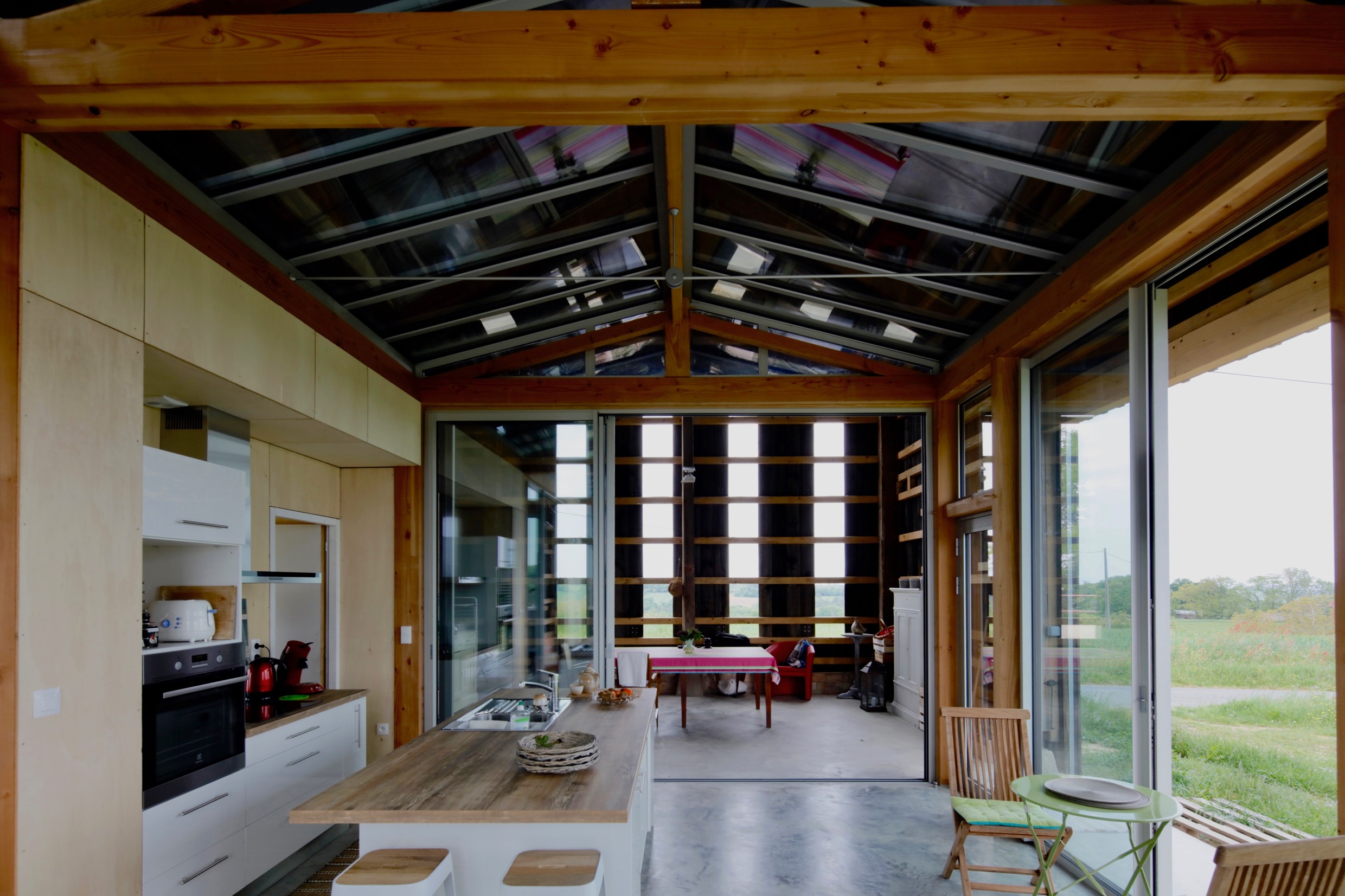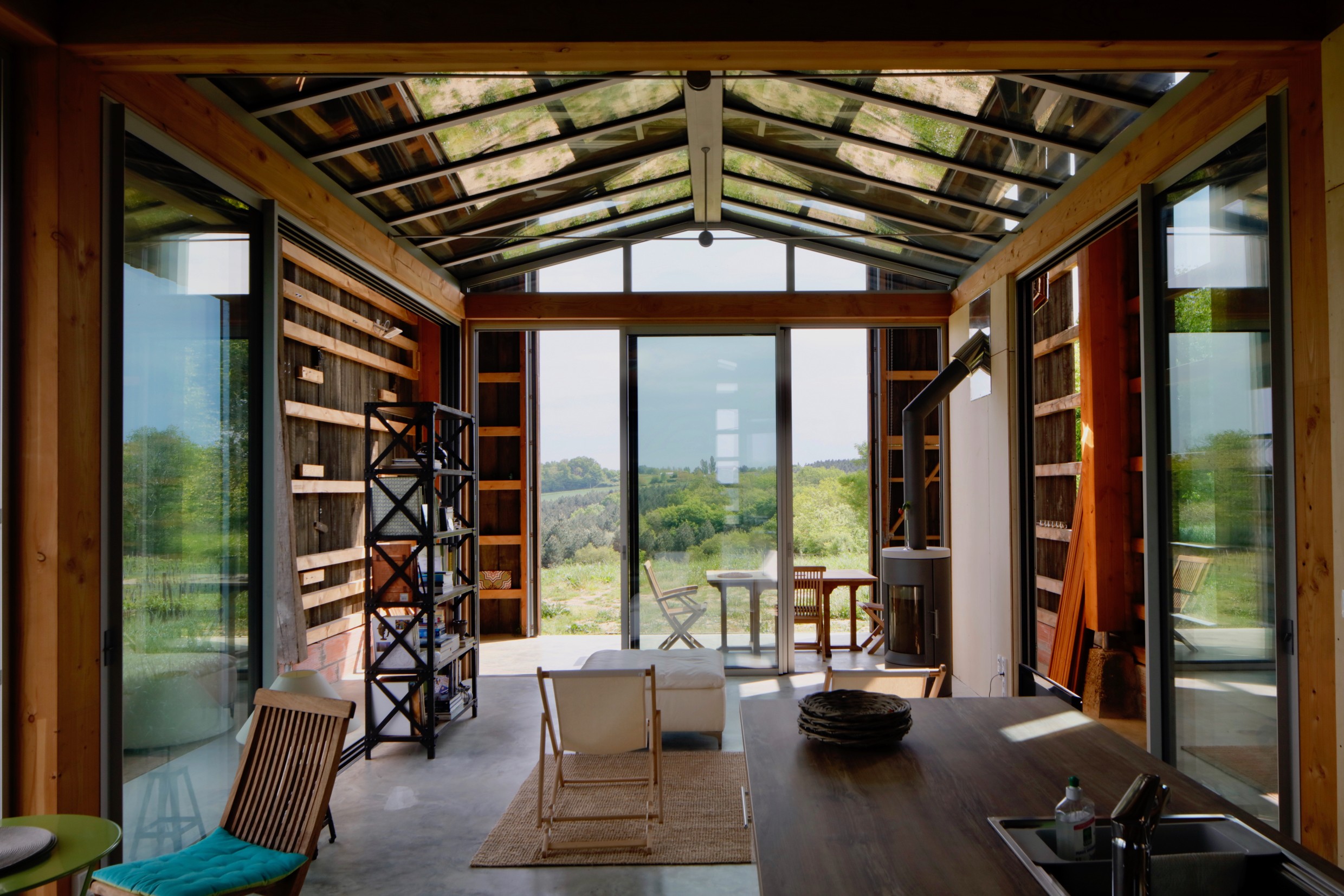 Le sol est continu, intérieur /extérieur. Il y a de l’espace entre la verrière et le vieux séchoir. On peut tourner autour, sortir ou entrer, tout ouvrir ou tout fermer.