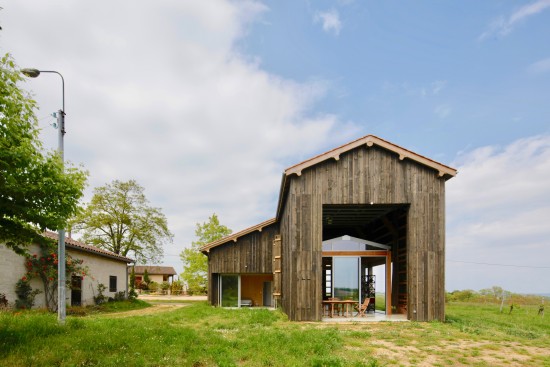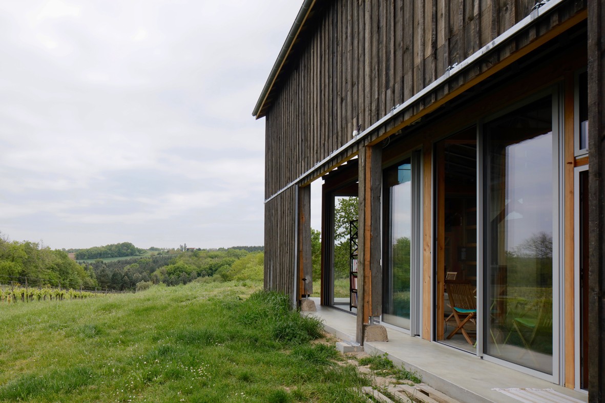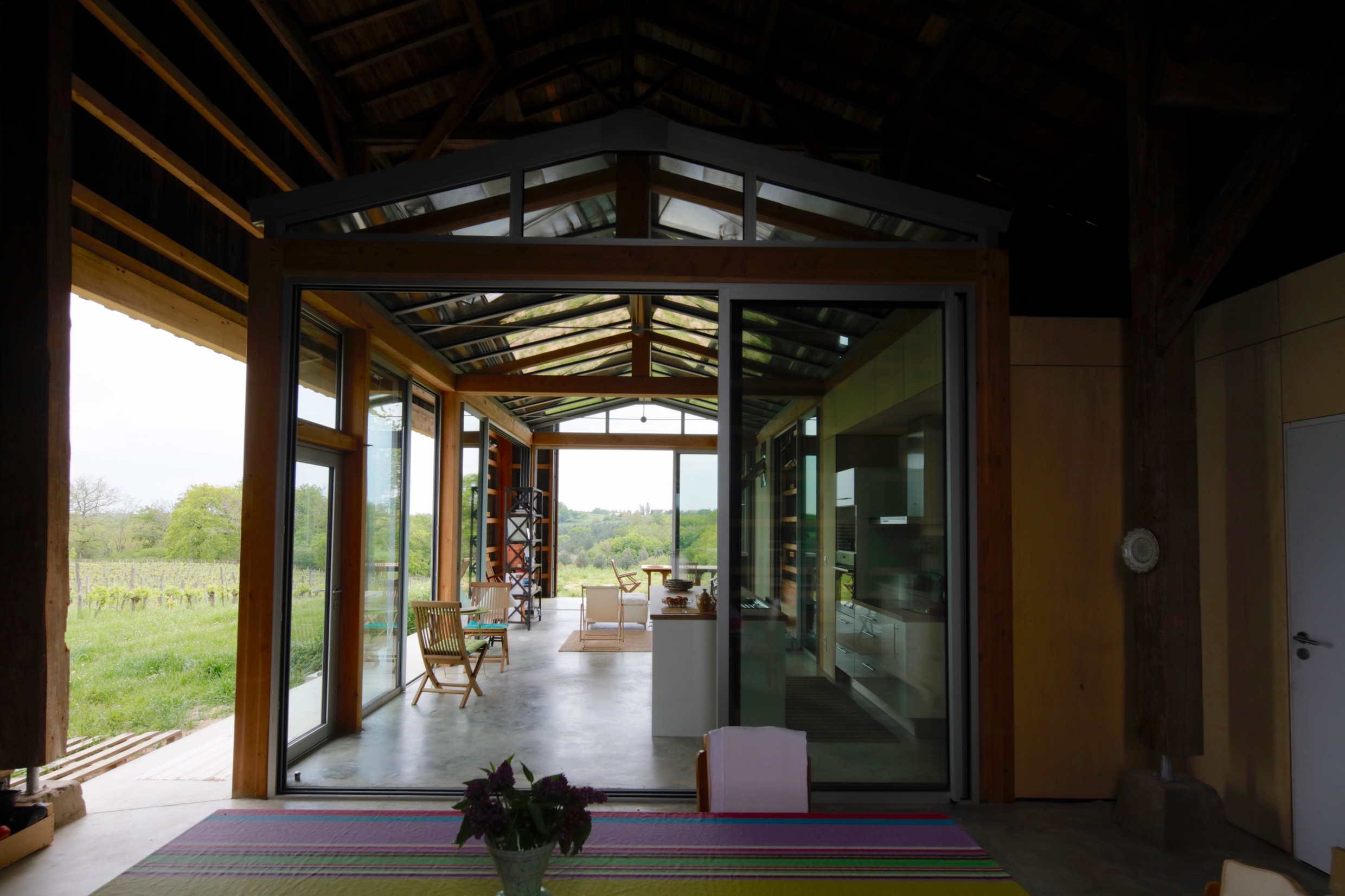 Transformation d’un vieux séchoir à tabac situé au cœur des vignes du Lot-et-Garonne. Le souhait de la cliente : l’habiter et pouvoir cuisiner face au paysage.