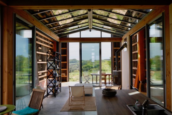 Seuls les montants qui tiennent la maison sont conservés : ceux du séchoir, la vieille charpente, les ouvrants verticaux, la grande porte vitrée mécanisée, la structure en bois et en métal et les grandes baies coulissantes qui l’enveloppent. Un module en bois clair, monté comme un meuble pour la chambre et la salle de bain, est installé dans l’appentis existant, toujours face au paysage. Comme un objet précieux dans une enveloppe rustique, presque invisible depuis l’extérieur.