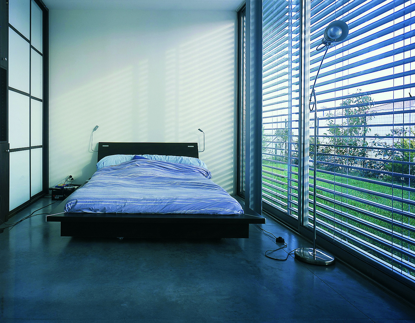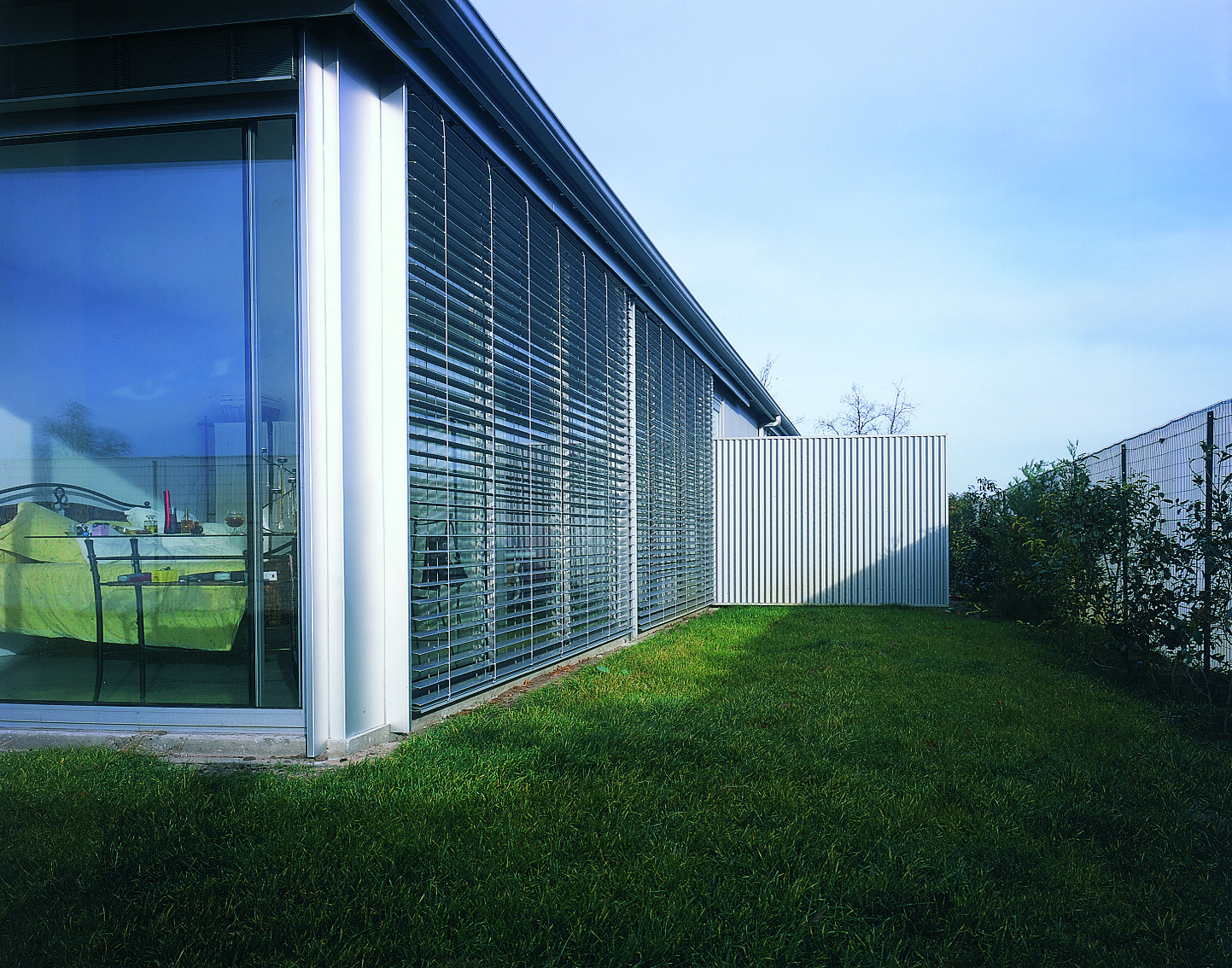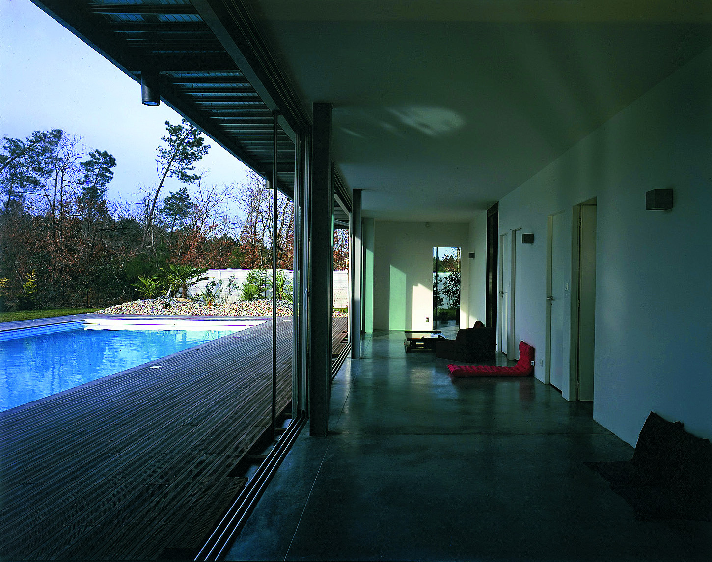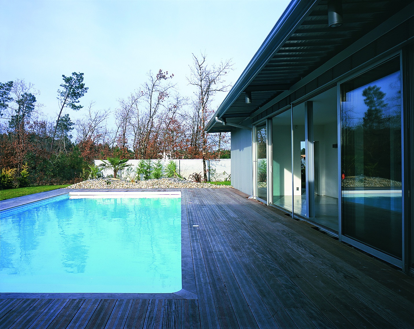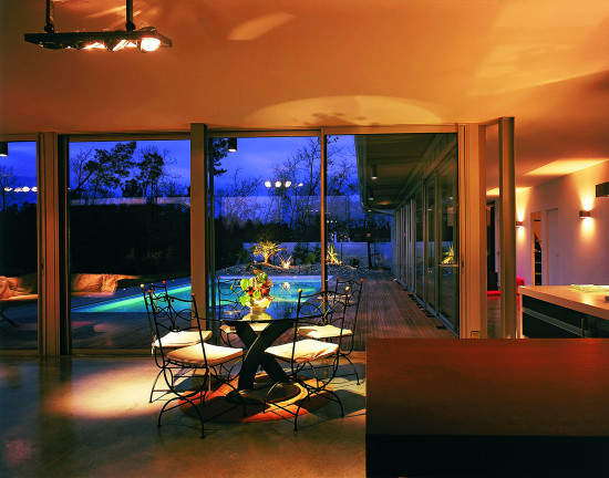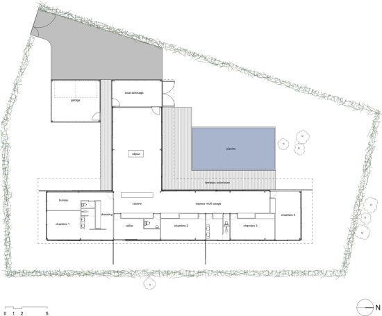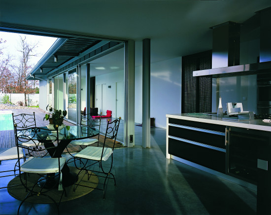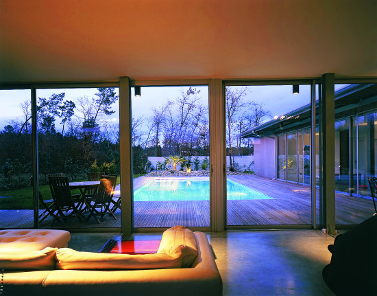 Le projet s’implante dans une parcelle de lotissement, un paysage plat, a priori sans qualité remarquable. L’idée est d’investir le terrain dans sa totalité, en considérant que la limite de propriété sera celle de la maison. Le projet se réfère directement aux « case study houses » américaines. La maison est de plain-pied, totalement vitrée avec de grands débords de toit. La structure est métallique et finement travaillée. Les fondations en pieux métalliques battus sortent du sol et viennent à trois mètres de haut porter la charpente. L’agencement des espaces sur la parcelle assure l’intimité de chaque pièce, de façon indépendante et sans vis-à-vis.